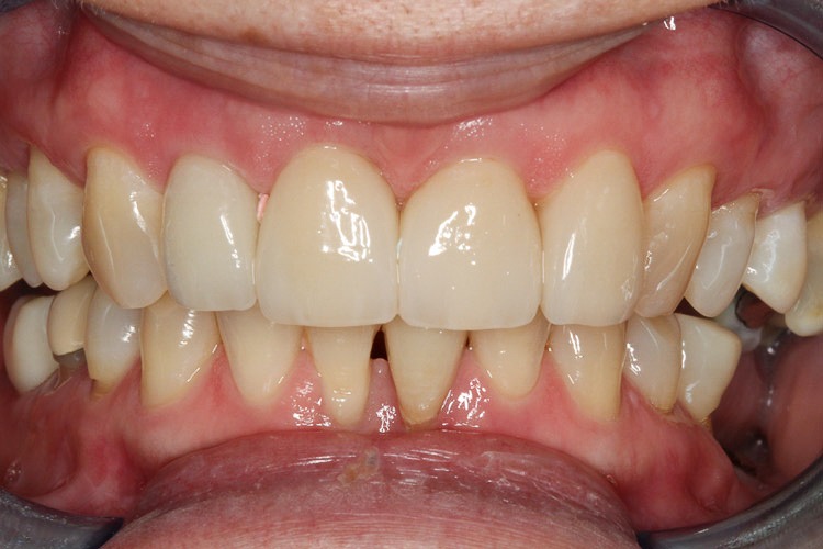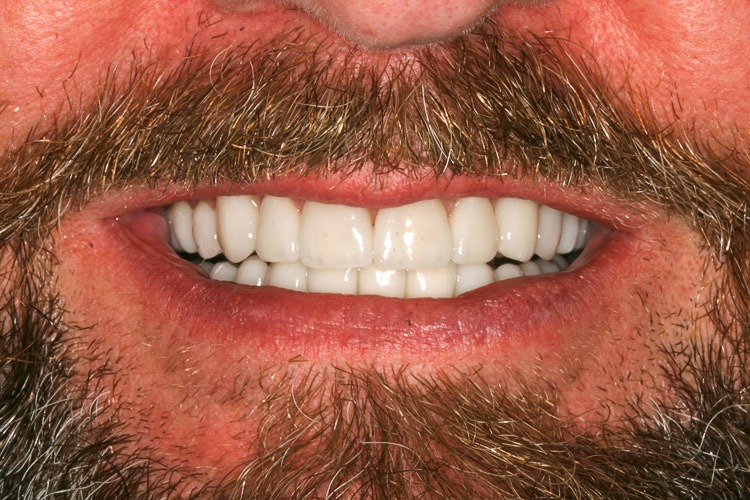 Full Mouth Reconstruction: Porcelain restorations placed to increase length and achieve youthful smile.