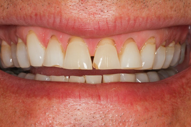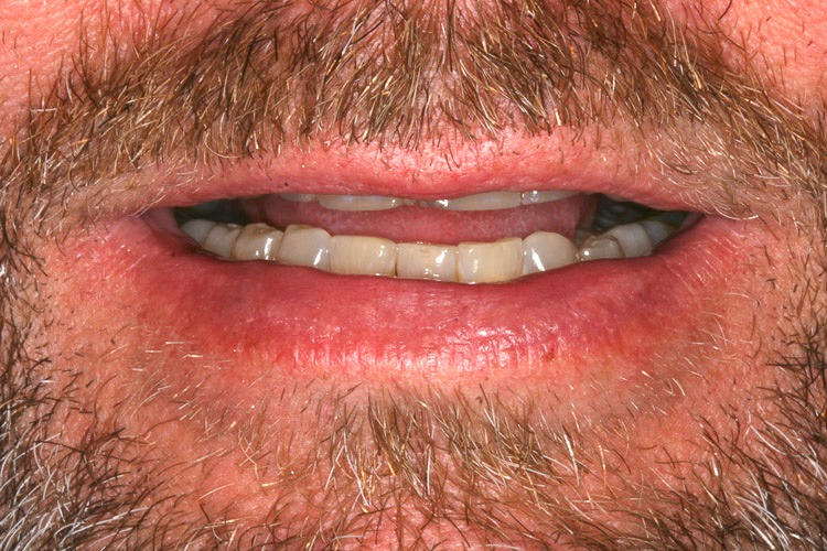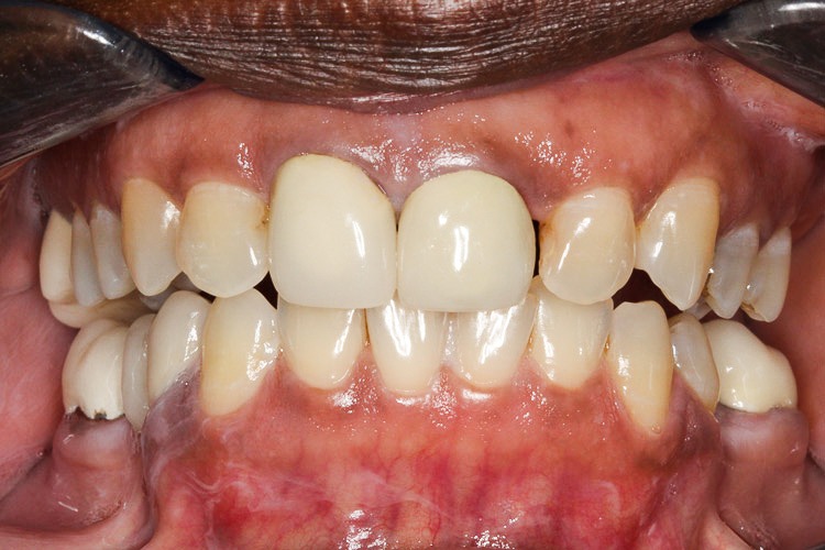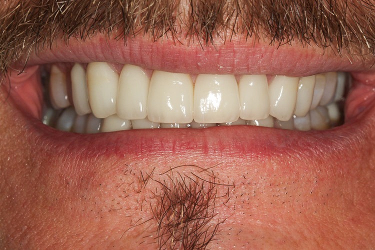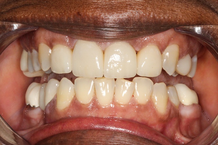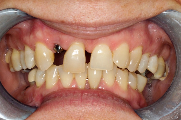 Implant Crown and Porcelain Veneers: Natural looking implant restoration and veneers to close spaces and gain symmetry.